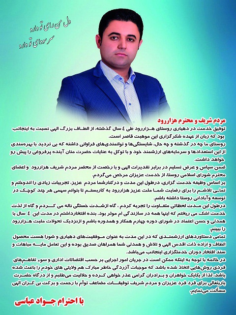 من هم از نزدیک شاهد تلاش ها ی مخلصانه و پیگیریهای مجدانه ایشان در دهیاری هزار رود علیا بوده ام و از ایشان کمال تشکر را دارم و آرزوی موفقیت برای شما همکار گرامی دارم.