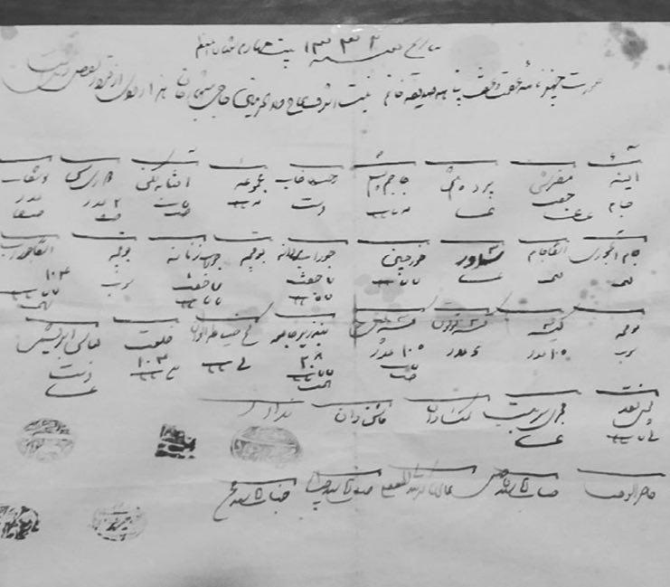 سند تاریخی از صورت جهیزیه بانوی هزاررودی در سال ۱۳۳۲ هجری قمری (۱۲۹۳ هجری شمسی) مربوط به بانو صدیقه